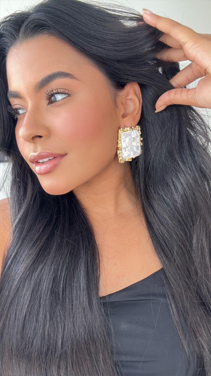 brinco madre pérola quadrado com bordas trabalhadas em dourado