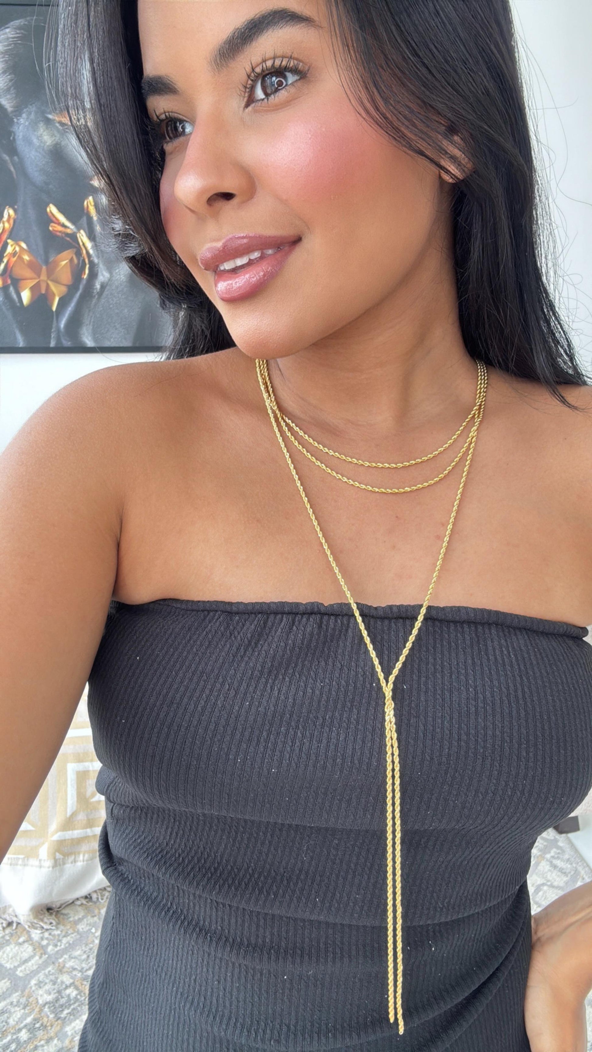 colar dourado de corrente em trio tendo um de extensão longa charmoso