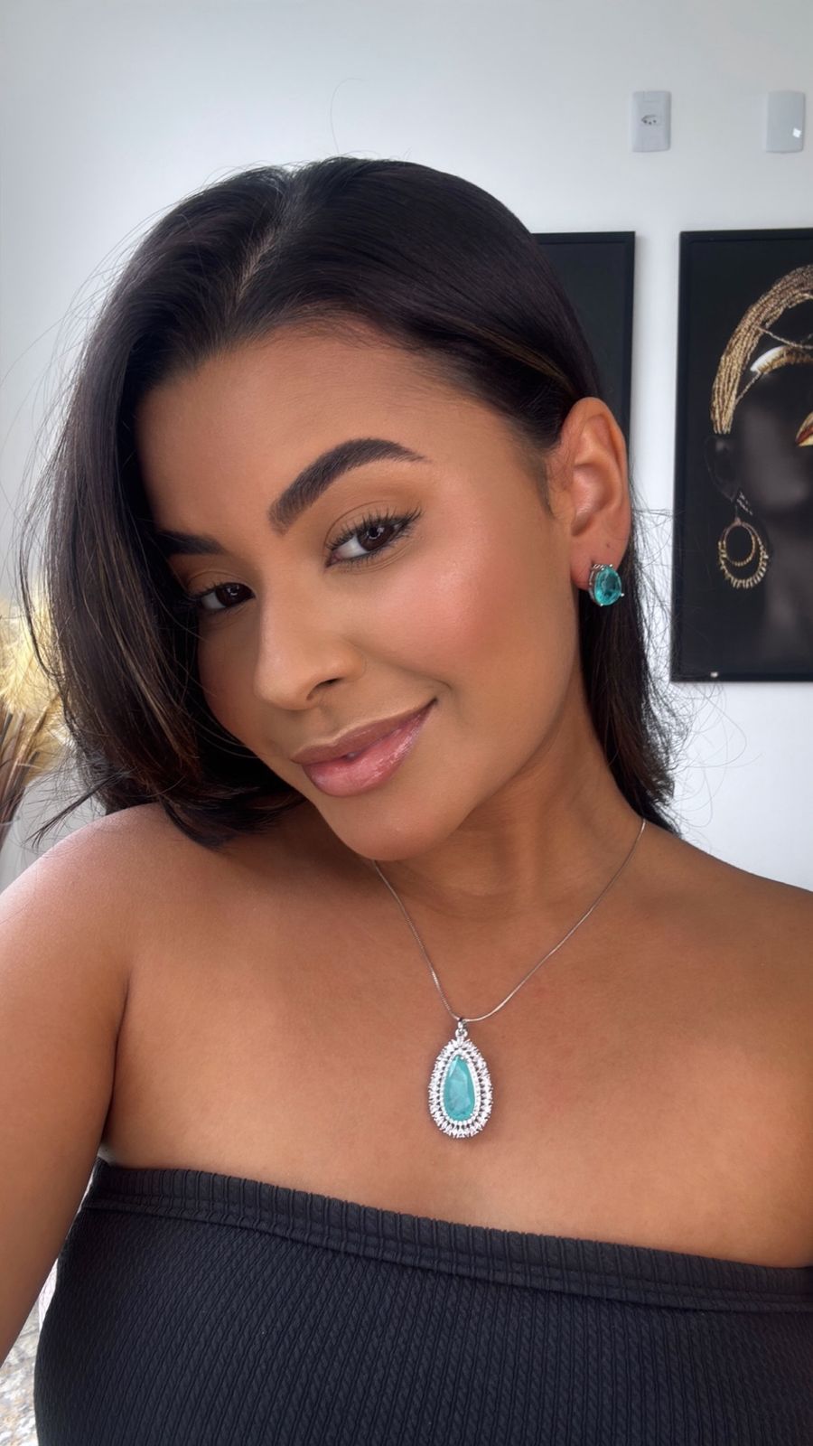 conjunto colar e brinco prata com pingente em pedra azul turquesa com detalhe cravejado nas laterais