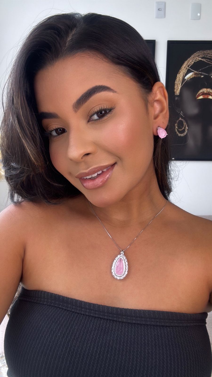 conjunto colar e brinco prata com pingente em pedra rosa com detalhe cravejado nas laterais