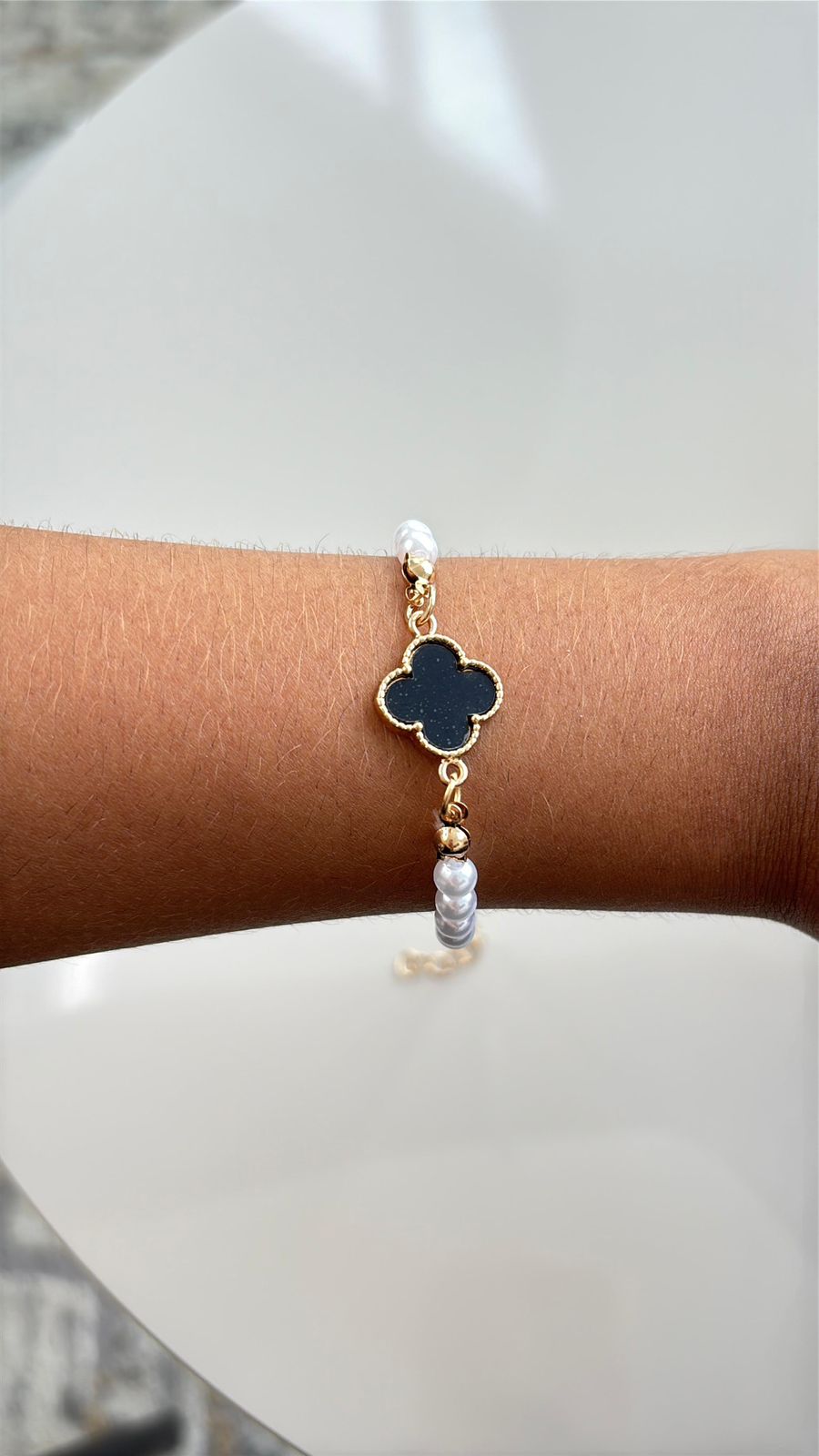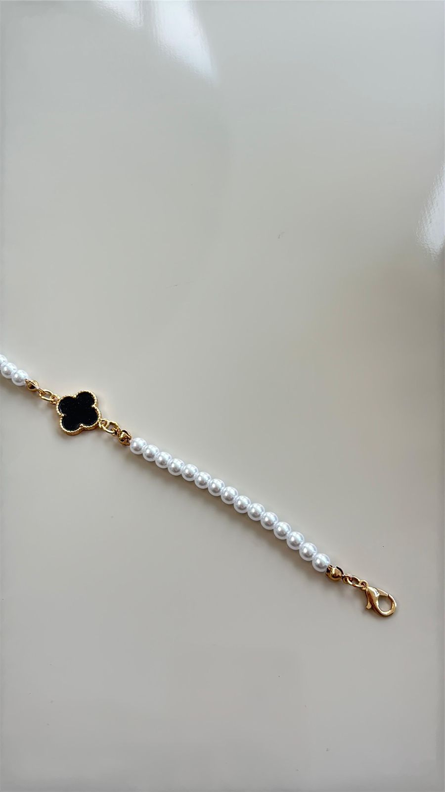 pulseira em pérola com detalhe em trevo preto com dourado