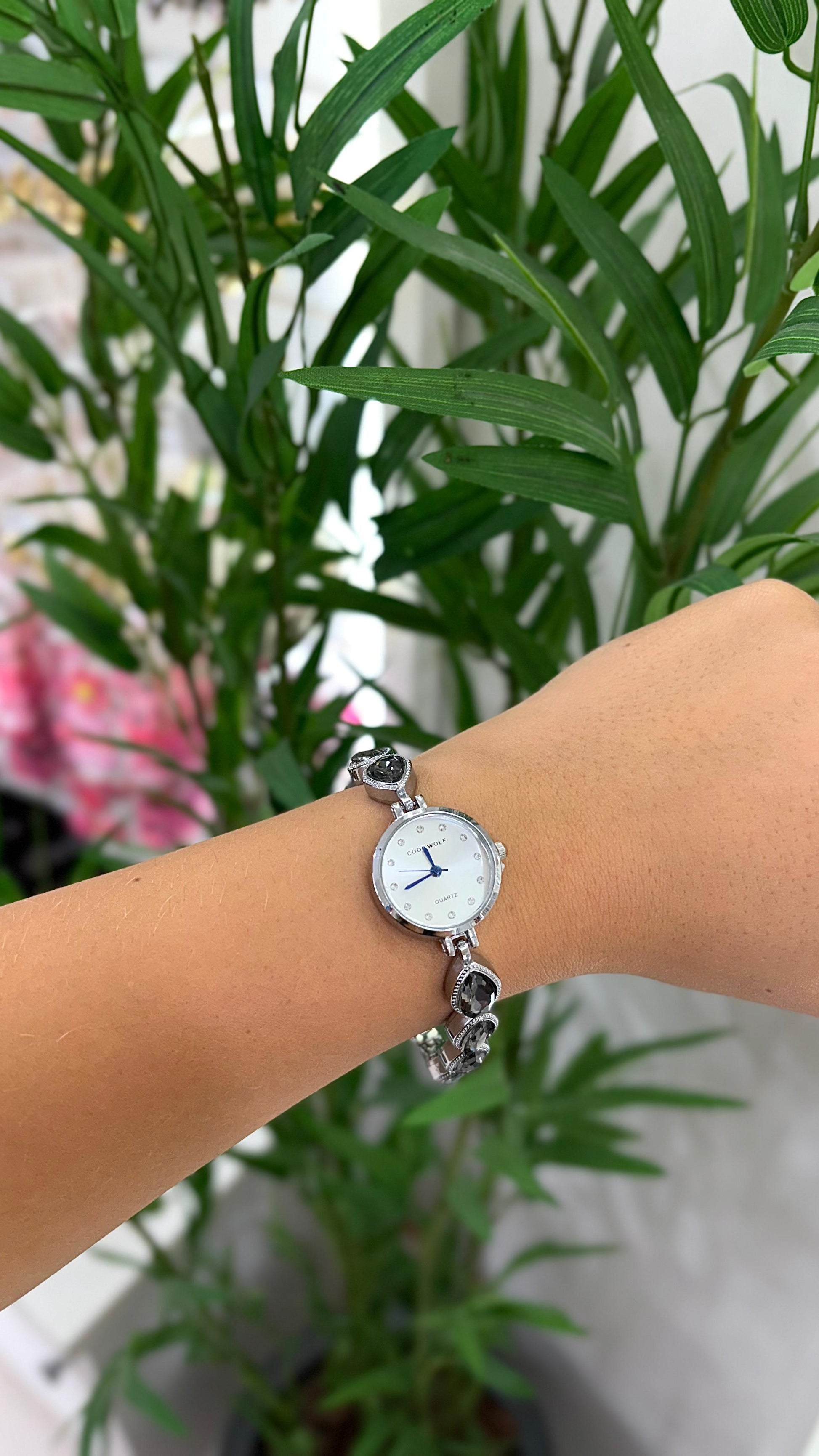 relógio prata com cinza fosco com detalhes em pedraria